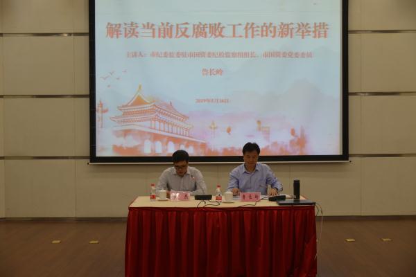 會議第二階段,開展廉政講座,由公司黨委書記、董事長陳杰同志主持。邀請市紀委監(jiān)委駐市國資委紀檢監(jiān)察組組長、市國資委黨委委員魯長嶺同志作“解讀當前反腐敗工作的新舉措”的專題講座。魯長嶺同志在講座中,重點解讀了當前紀委監(jiān)委體制機制改革情況,重點介紹了我市紀委監(jiān)委查辦市屬國有企業(yè)腐敗案件情況,重點分析了當前反腐敗工作的新舉措。整場講座有觀點有解讀,有論述有案例,既寓意深刻又深入淺出,對全面提高公司黨員干部素質(zhì),提升廉潔自律意識,增強拒腐防變能力,具有很強的警示效果和指導意義。