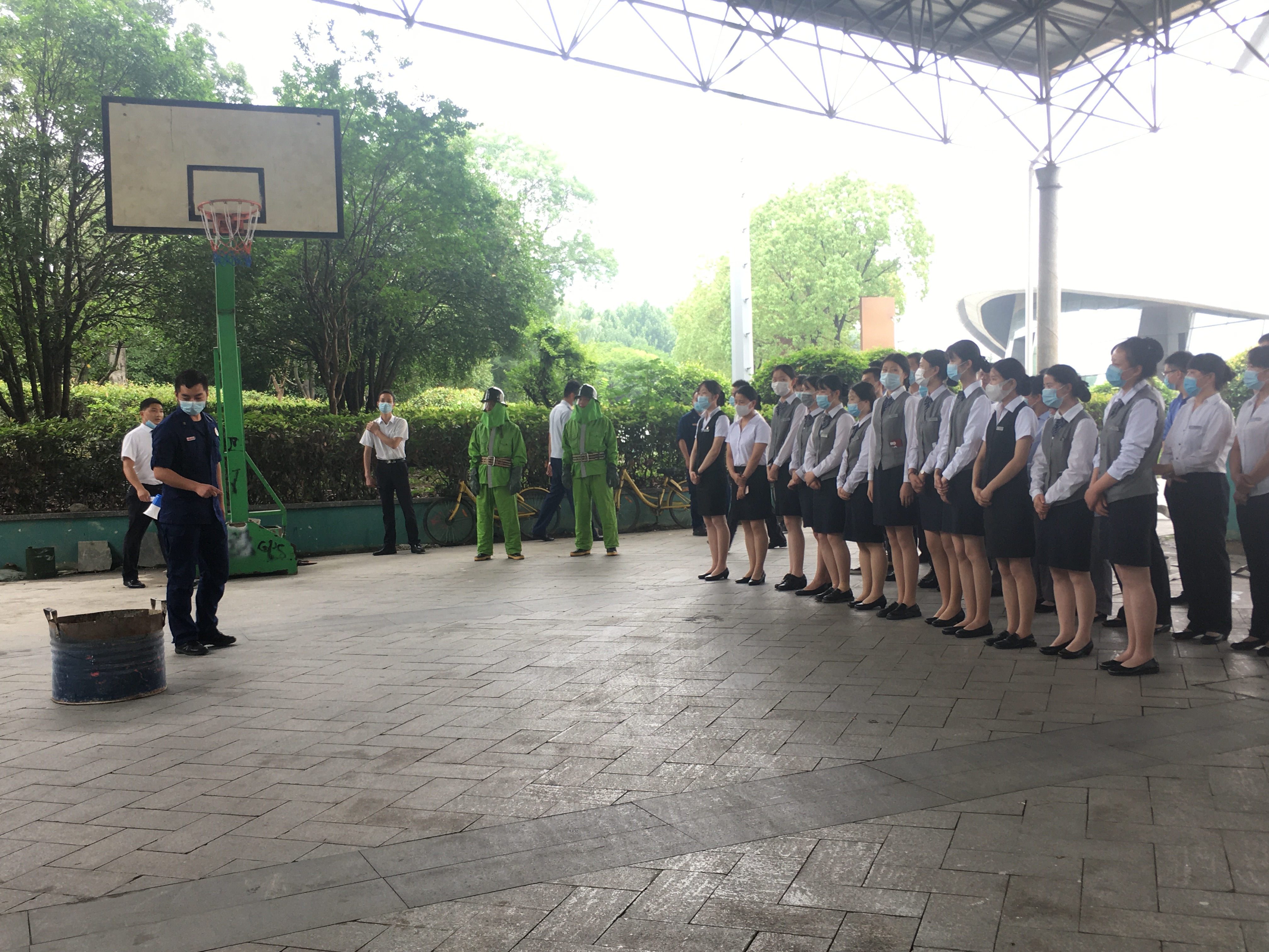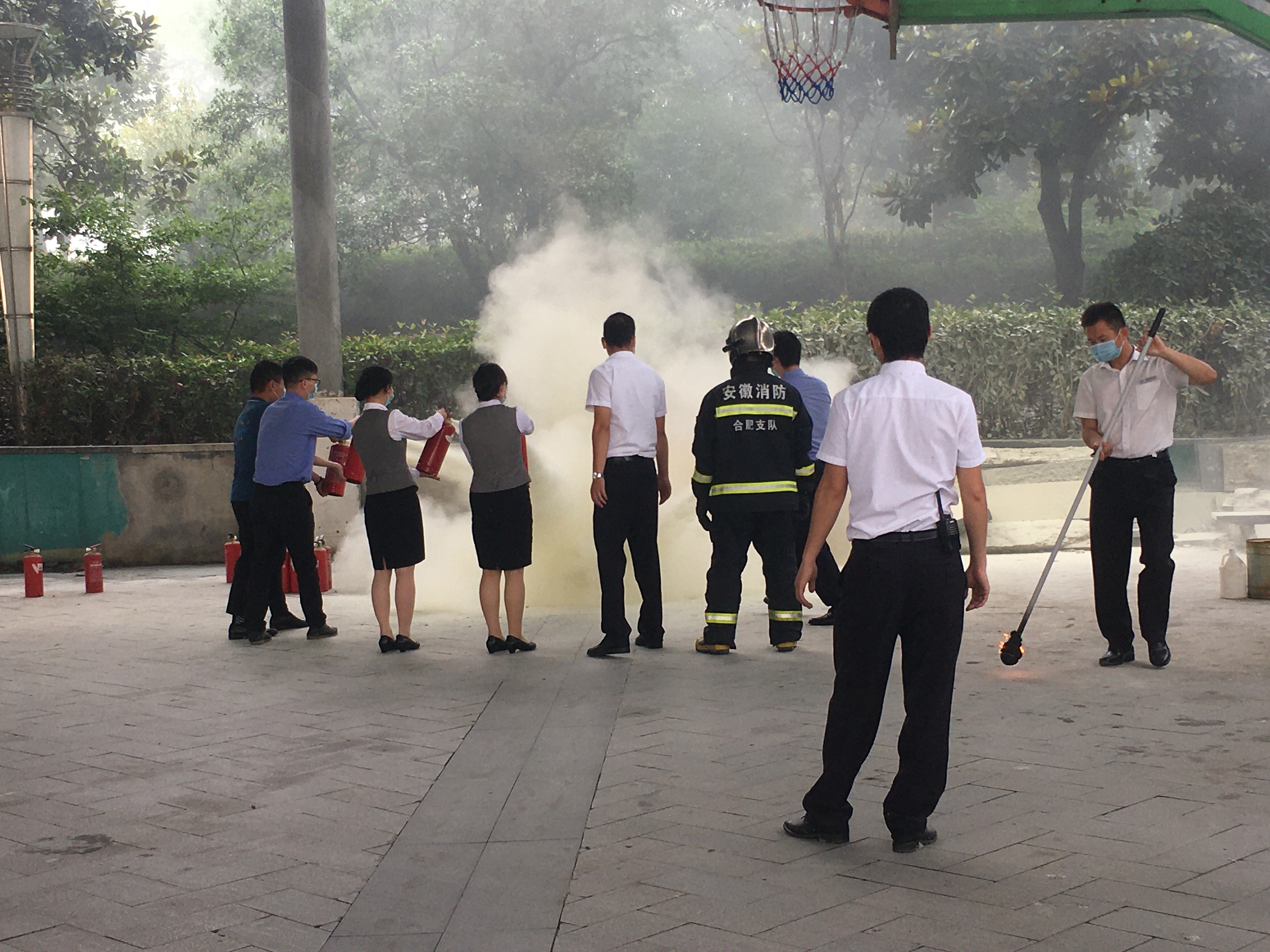 培訓(xùn)后,為提高員工實戰(zhàn)經(jīng)驗和協(xié)同作戰(zhàn)能力,組織所有員工在劇院外圍汽車庫集合,聯(lián)合合肥消防支隊天鵝湖中隊在汽車庫開展消防滅火演練。演練前消防隊員向大家仔細講解了滅火器的使用方法和注意事項,并做現(xiàn)場滅火演示。隨后分組組織員工進行滅火實操演練。