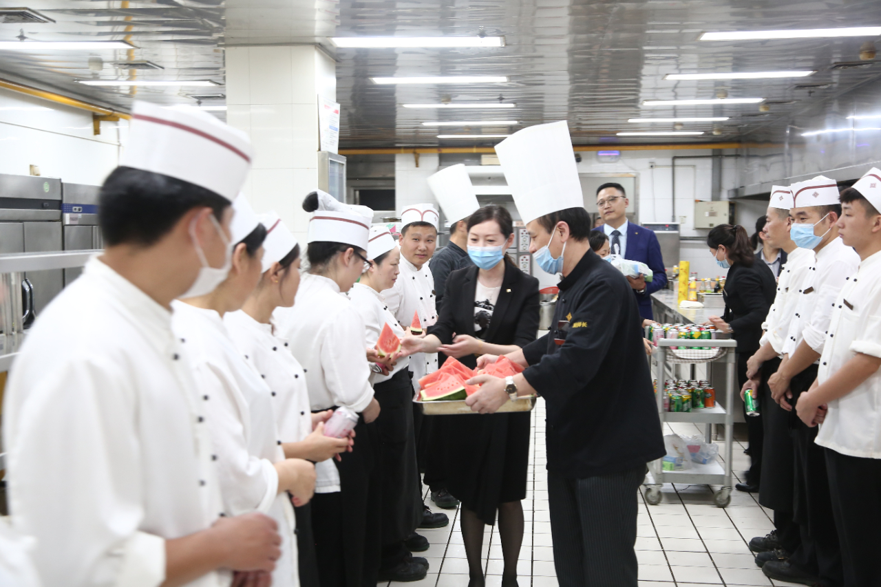 2020年8月18日下午,合肥泓瑞金陵大酒店管理層組織高溫慰問活動,由總經(jīng)理徐誠女士、副總經(jīng)理闞道生先生帶隊,對酒店大堂外的禮賓、安保、PA以及餐飲后廚管事部、工程部、洗衣房等高溫工作區(qū)域的酒店一線工作人員進行慰問,感謝他們的辛勤工作和無私奉獻,讓一線員工們在酷暑感受到一絲絲涼意。