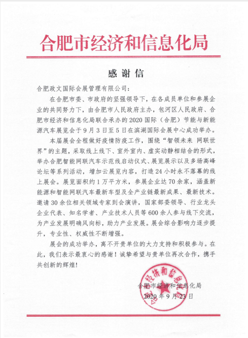 近期,政文會展收到2020國際(合肥)節(jié)能與新能源汽車展覽會組委會發(fā)來的感謝信。信中指出,政文會展作為場館服務(wù)保障單位,為2020國際(合肥)節(jié)能與新能源汽車展覽會的成功舉辦作出了積極貢獻。