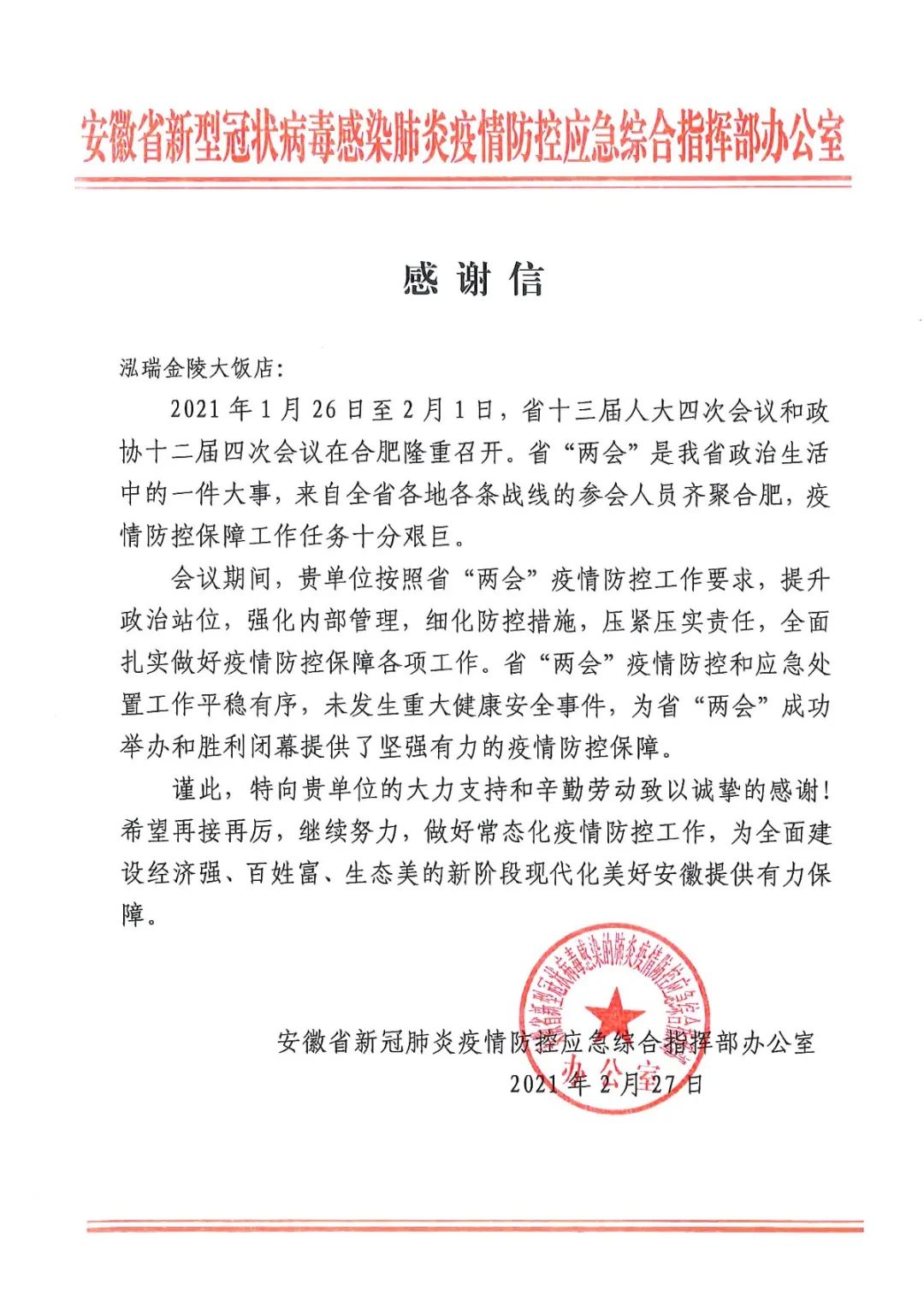 2021年3月1日,合肥泓瑞金陵大酒店收到來自安徽省新冠肺炎疫情防控應急綜合指揮部辦公室的一封感謝信,對酒店在兩會期間的各項服務保障工作給予了充分肯定。