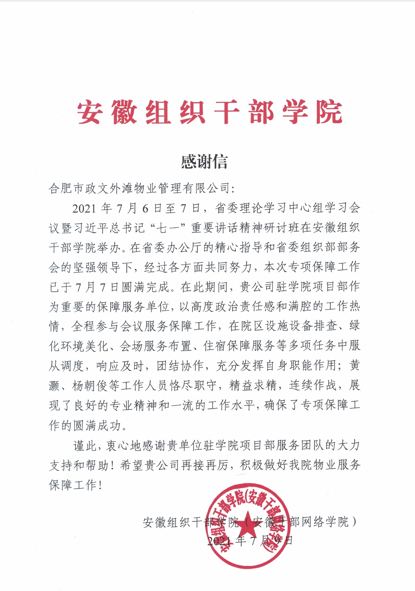 安徽組織干部學(xué)院對(duì)此次會(huì)議的保障工作十分滿(mǎn)意,特地向公司發(fā)來(lái)“感謝信”,組織干部學(xué)院項(xiàng)目部全體員工深受鼓舞,表示將在今后的工作中進(jìn)一步做好學(xué)院后勤保障服務(wù),不斷提高服務(wù)保障水平。