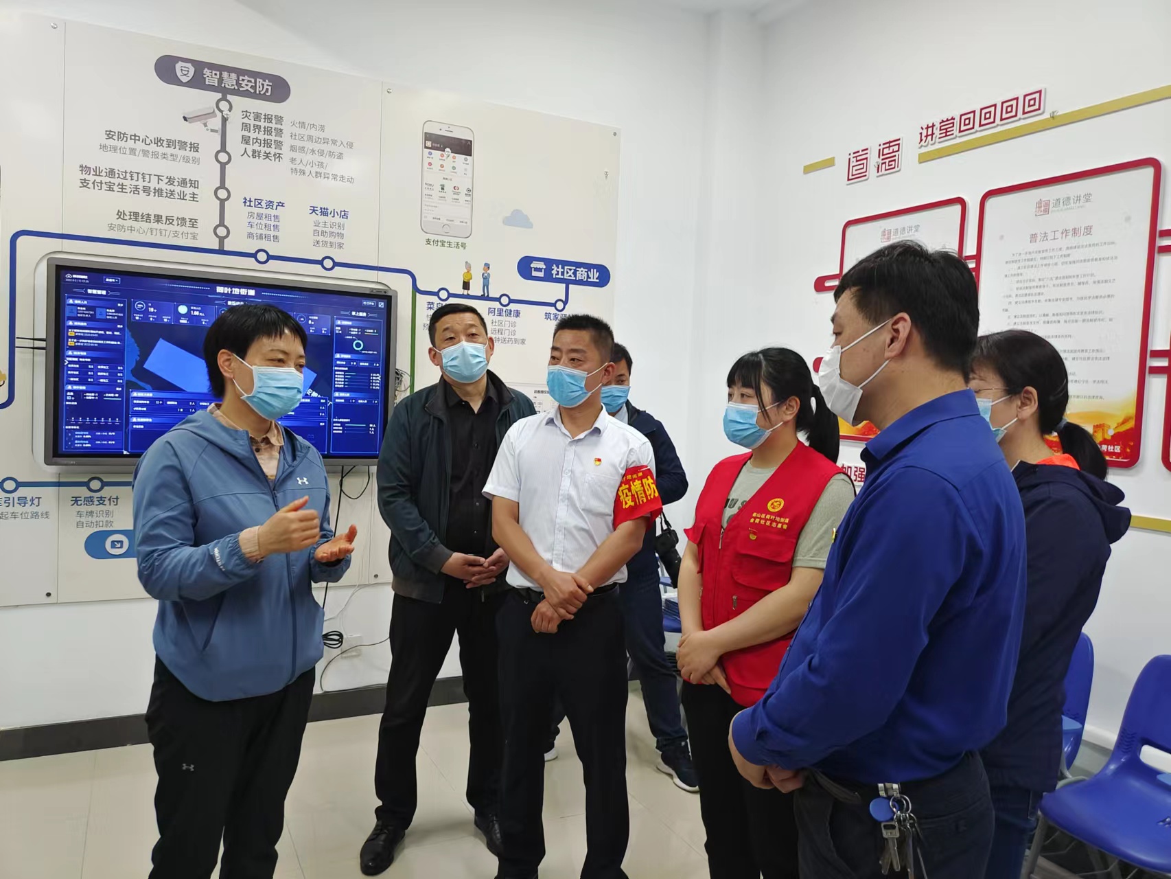 5月3日上午,區(qū)委書記王海霞在荷葉地街道、金荷社區(qū)等人員陪同下,至政文外灘物業(yè)在管項(xiàng)目陶然居小區(qū)調(diào)研疫情防控及智慧小區(qū)建設(shè)情況。