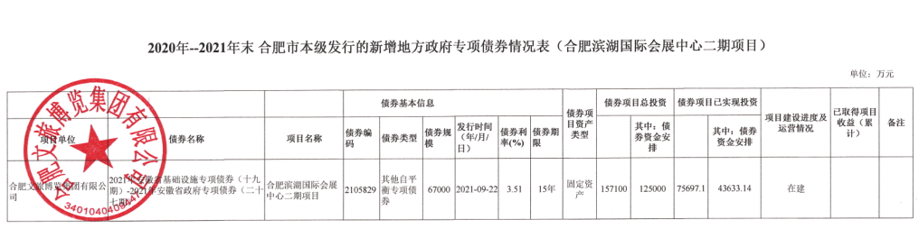 2021年度政府債券存續(xù)期信息公開(合肥濱湖國際會展中心二期項目)