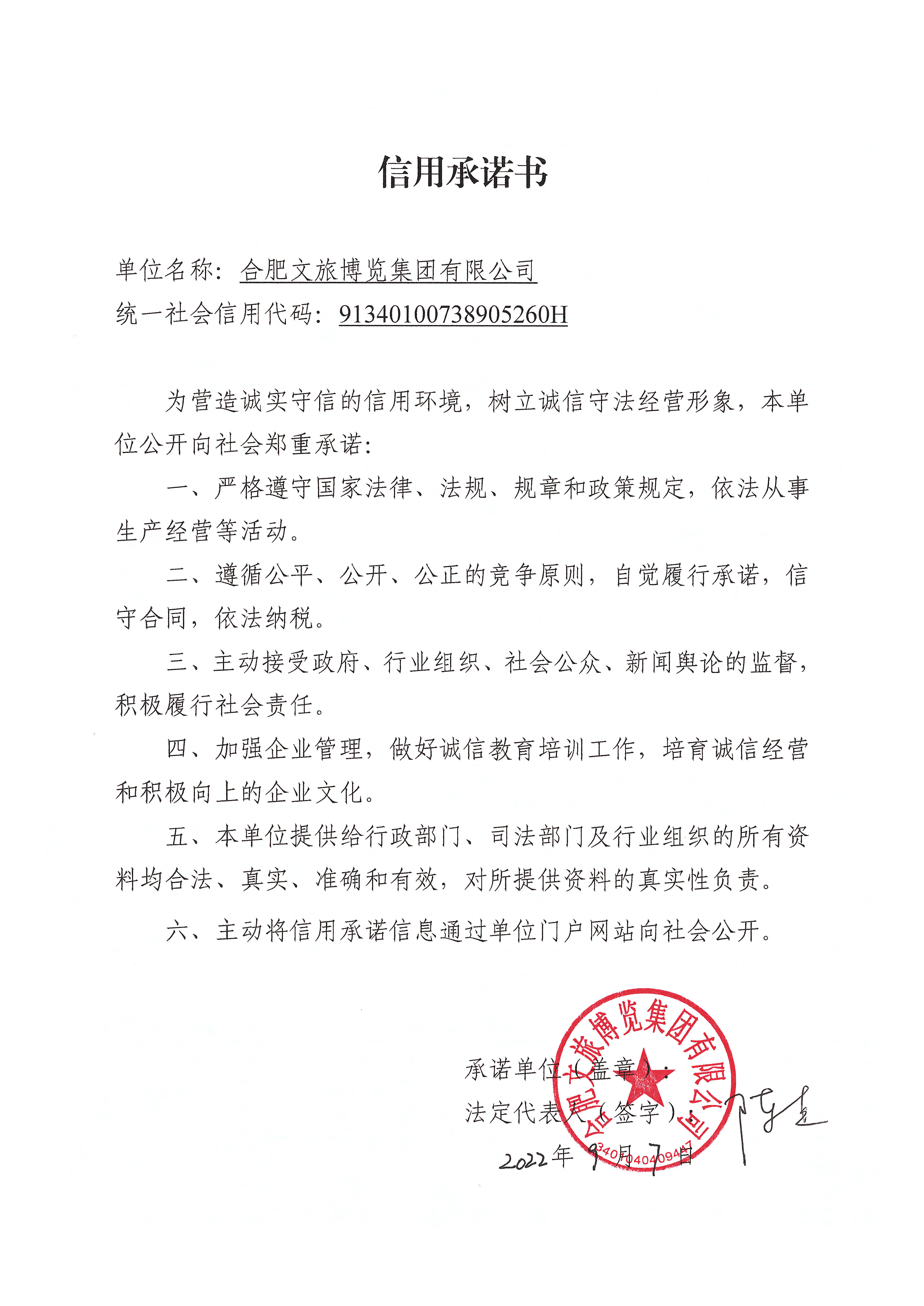 合肥文旅博覽集團(tuán)有限公司信用承諾書(shū)