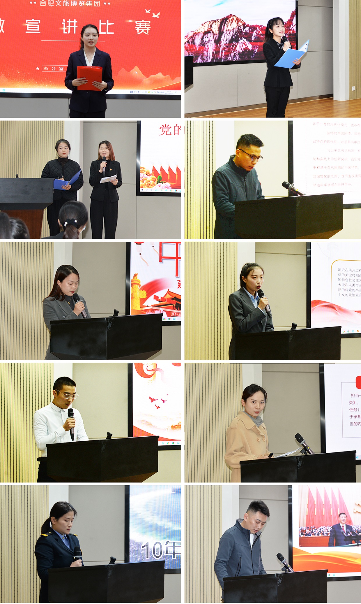 來(lái)自集團(tuán)各部門(mén)、各所屬企業(yè)的11組選手參加了此次宣講比賽。比賽現(xiàn)場(chǎng),選手們個(gè)個(gè)精神飽滿,緊緊圍繞學(xué)習(xí)宣傳貫徹黨的二十大精神,結(jié)合自身工作、生活,用生動(dòng)的語(yǔ)言、鮮活的故事、飽滿的熱情回顧了黨過(guò)去五年工作和新時(shí)代十年的偉大變革,展現(xiàn)了文旅人昂揚(yáng)向上的精神風(fēng)貌,表達(dá)了建功新時(shí)代的信心和決心。