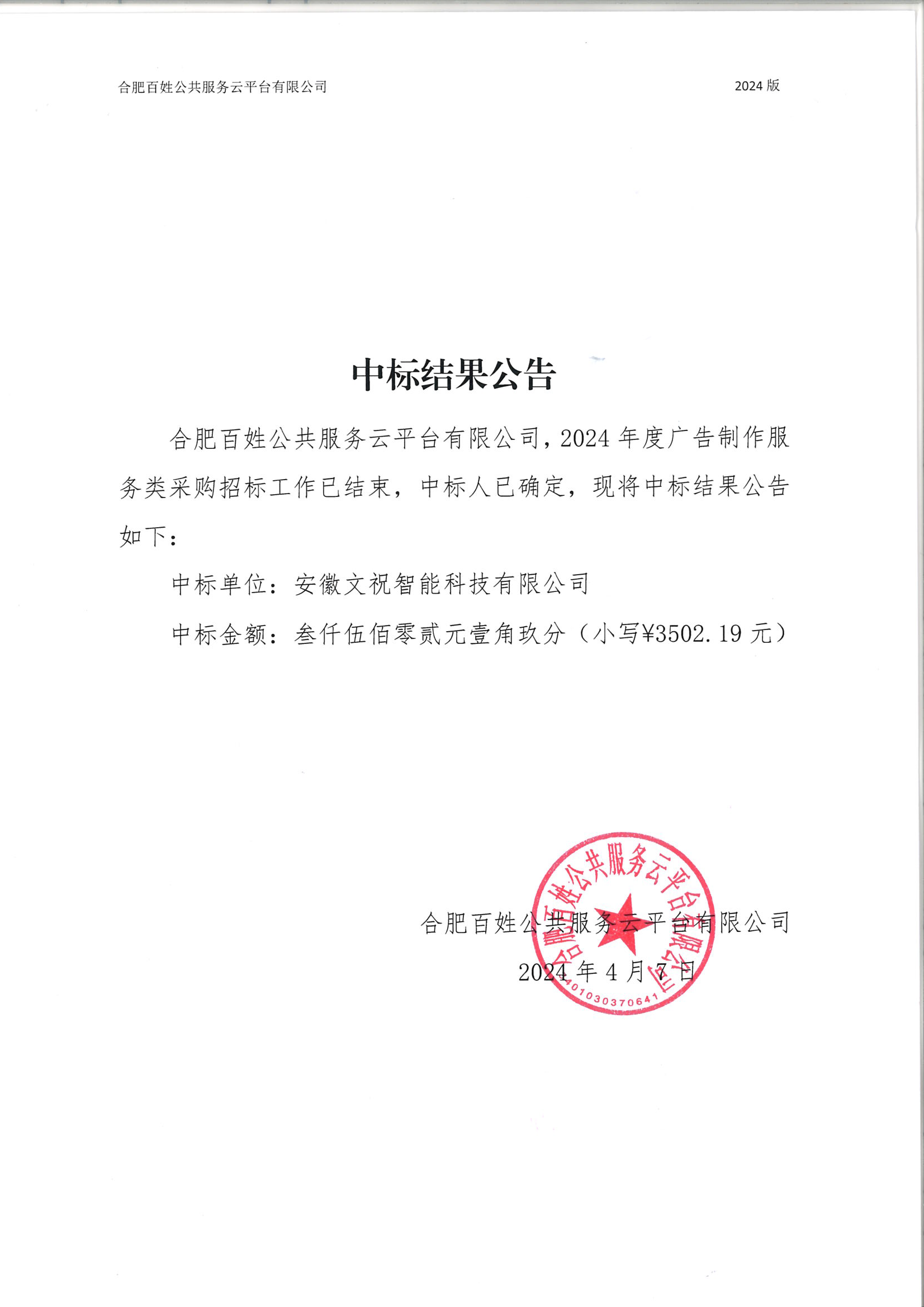 合肥百姓公共服務(wù)云平臺有限公司廣告制作服務(wù)中標公告