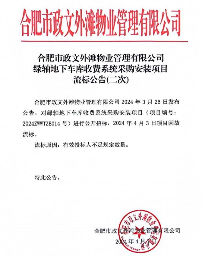 合肥市政文外灘物業(yè)管理有限公司綠軸地下車庫(kù)收費(fèi)系統(tǒng)采購(gòu)安裝項(xiàng)目流標(biāo)公告(二次)