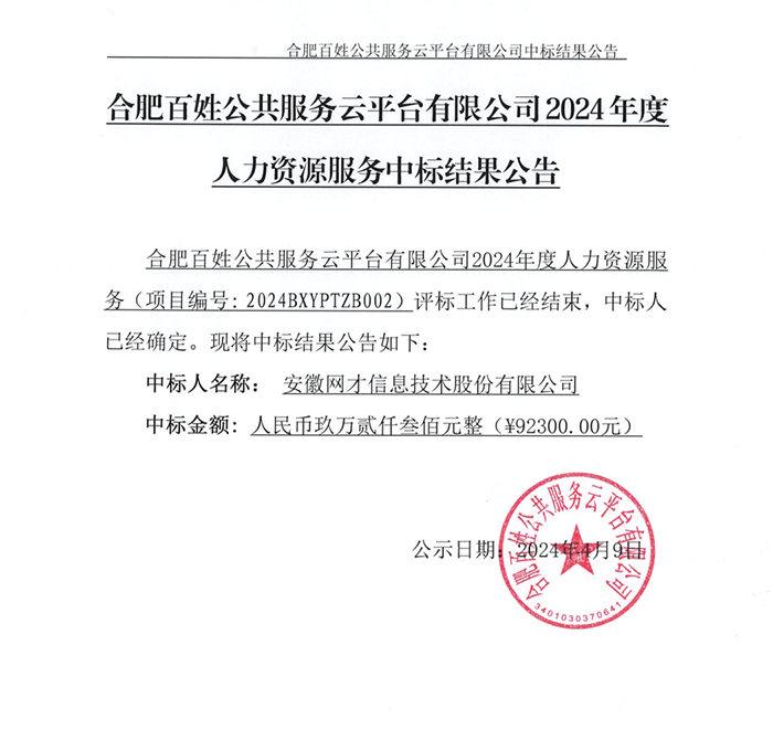 合肥百姓公共服務云平臺有限公司2024年度人力資源服務中標結(jié)果公告