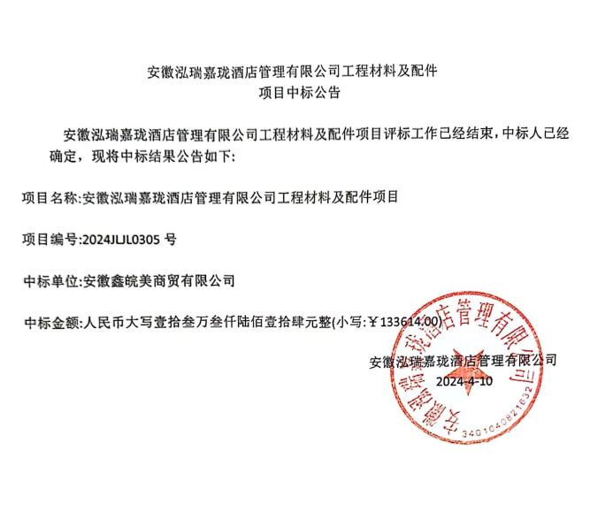 安徽泓瑞嘉瓏酒店管理有限公司工程材料及配件項目中標公告