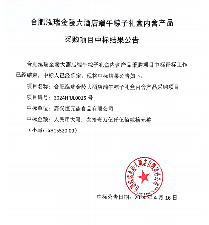 合肥泓瑞金陵大酒店端午粽子禮盒內(nèi)含產(chǎn)品采購項目中標(biāo)結(jié)果公告
