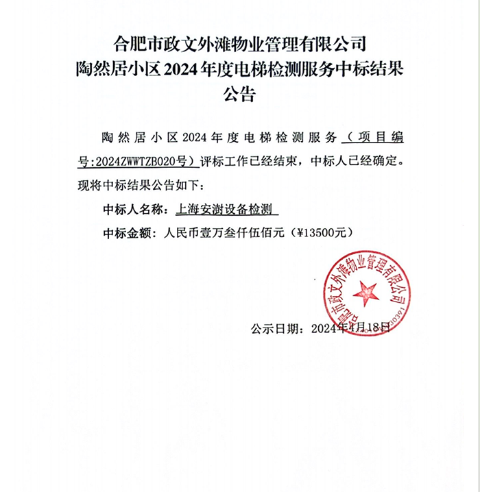 合肥市政文外灘物業(yè)管理有限公司陶然居小區(qū)2024年度電梯檢測服務中標結(jié)果公告
