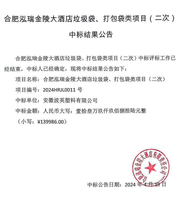 合肥泓瑞金陵大酒店垃圾袋、打包袋類項(xiàng)目(二次) 中標(biāo)結(jié)果公告