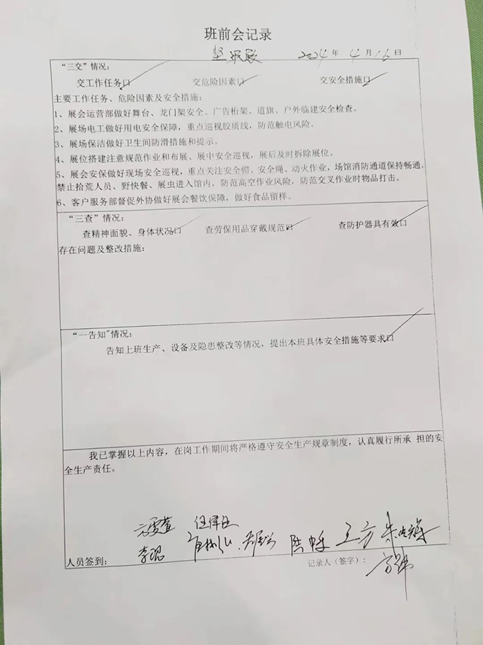 在活動(dòng)前期的項(xiàng)目協(xié)調(diào)會(huì)上,項(xiàng)目經(jīng)理圍繞“主題黨日活動(dòng)”要求和工作實(shí)際,強(qiáng)調(diào)了本次展會(huì)的安全管理問題,項(xiàng)目組成員認(rèn)真學(xué)習(xí)了習(xí)近平總書記關(guān)于國家安全的重要講話和重要指示批示精神,并簽署了“一會(huì)三安”安全生產(chǎn)班前會(huì)記錄表。