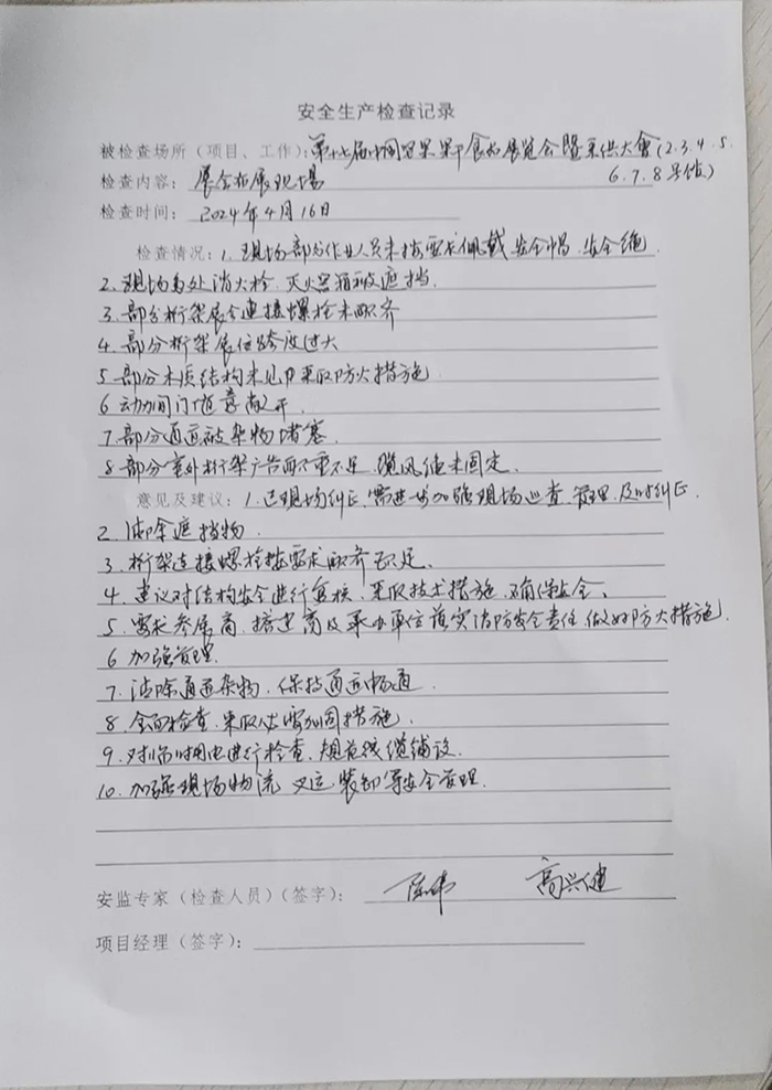 公司安委辦會(huì)同展會(huì)運(yùn)營部對展位、廣告和舞臺等搭建情況進(jìn)行安全檢查工作,現(xiàn)場糾正違規(guī)行為,及時(shí)告知項(xiàng)目經(jīng)理檢查中發(fā)現(xiàn)的安全隱患,持續(xù)跟進(jìn)隱患整改情況,為強(qiáng)化現(xiàn)場安全管理,創(chuàng)建安全布展環(huán)境提供有力保障。