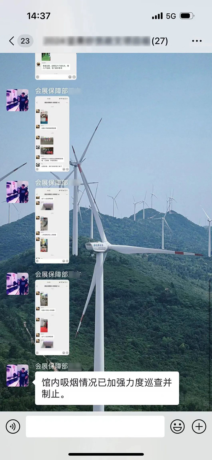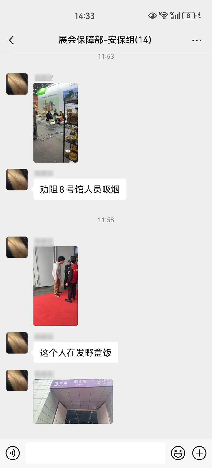 安保班組每天都組織保安巡邏隊(duì)在展館內(nèi)及外圍、地下車庫展館四周巡檢,做好現(xiàn)場安全秩序的管理;同時(shí)集中巡查野快餐、展蟲的情況,進(jìn)行清理;對館內(nèi)存在的吸煙、污染較大的施工作業(yè)等安全隱患的行為進(jìn)行巡查,提醒糾正。