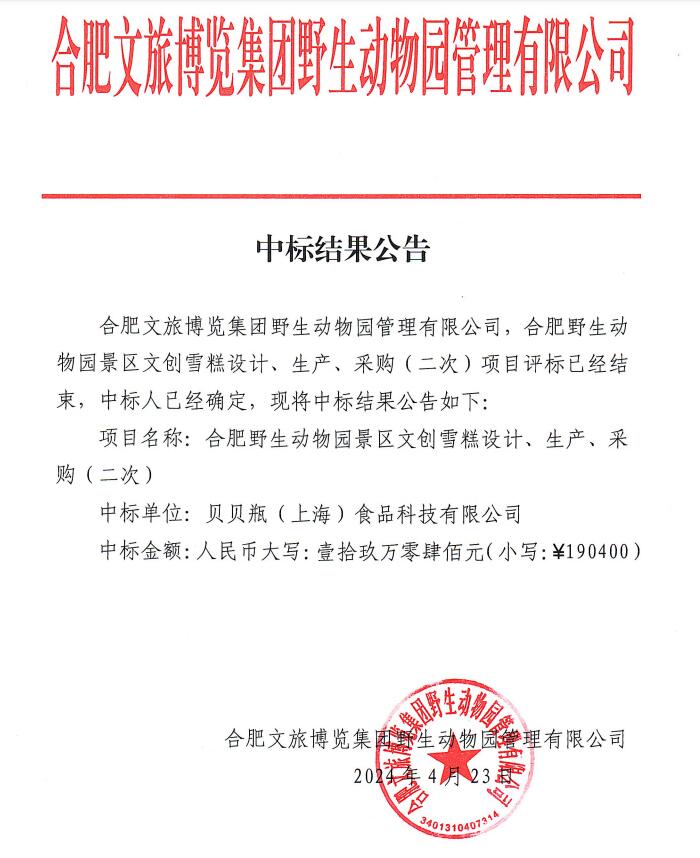 合肥野生動(dòng)物園文創(chuàng)雪糕項(xiàng)目中標(biāo)結(jié)果公告