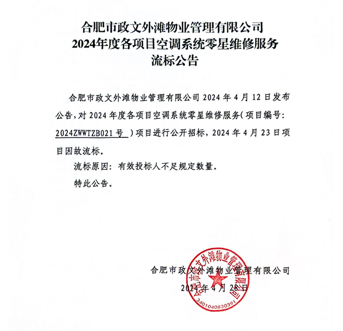合肥市政文外灘物業(yè)管理有限公司2024年度各項目空調(diào)系統(tǒng)零星維修服務(wù)流標(biāo)公告
