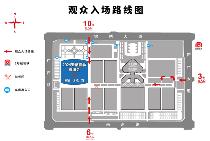 1. 普通觀眾請由上圖所示錦繡大道10號道口、廬州大道3號道口及南京路6號道口進出參觀。