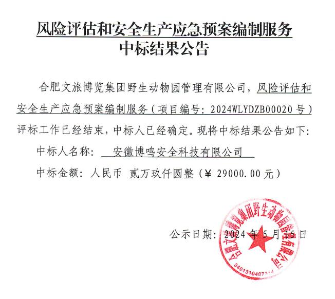合肥文旅博覽集團(tuán)野生動(dòng)物園管理有限公司風(fēng)險(xiǎn)評(píng)估和安全生產(chǎn)應(yīng)急預(yù)案編制服務(wù)中標(biāo)結(jié)果公告