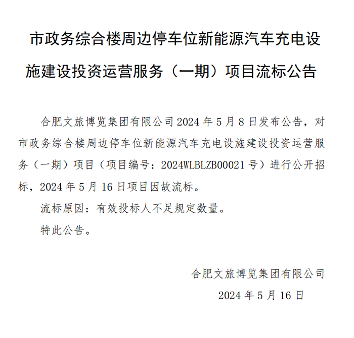 市政務綜合樓周邊停車位新能源汽車充電設施建設投資運營服務(一期)項目流標公告