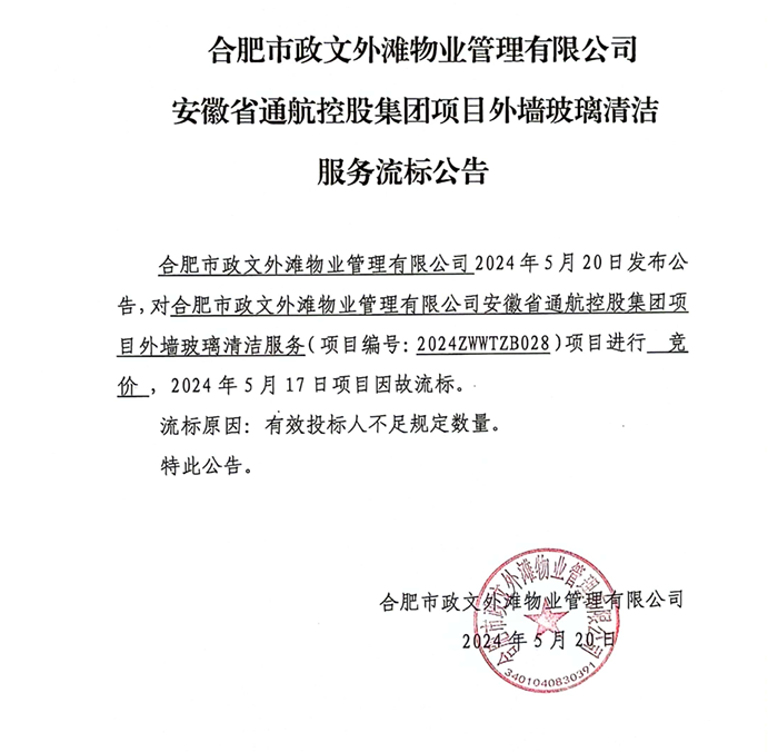合肥市政文外灘物業(yè)管理有限公司安徽省通航控股集團(tuán)項目外墻玻璃清潔服務(wù)流標(biāo)公告