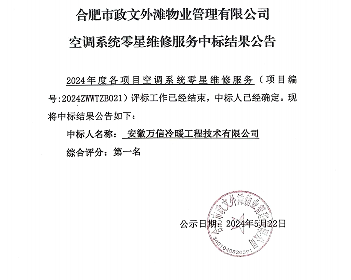 合肥市政文外灘物業(yè)管理有限公司空調(diào)系統(tǒng)零星維修服務(wù)中標(biāo)結(jié)果公告