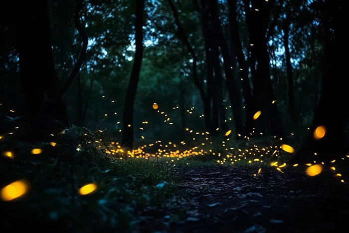晚風(fēng)吹拂,踏進(jìn)靜謐的森林,驚起星星點點的螢火之光,展現(xiàn)出獨屬夏夜的寧靜和美妙。晴電忽穿樹,相識有流螢,螢火蟲一閃一閃似繁星,點亮夜空,夏夜最美麗的風(fēng)景,莫過于此了。