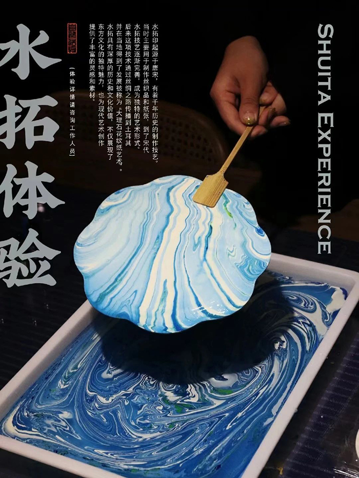 以扇為紙,以水作畫,自然造物,水拓畫起源于唐宋的墨池畫,是我國水墨畫眾多畫法其中的一種畫,每一次浸泡邂逅獨一無二的花紋。