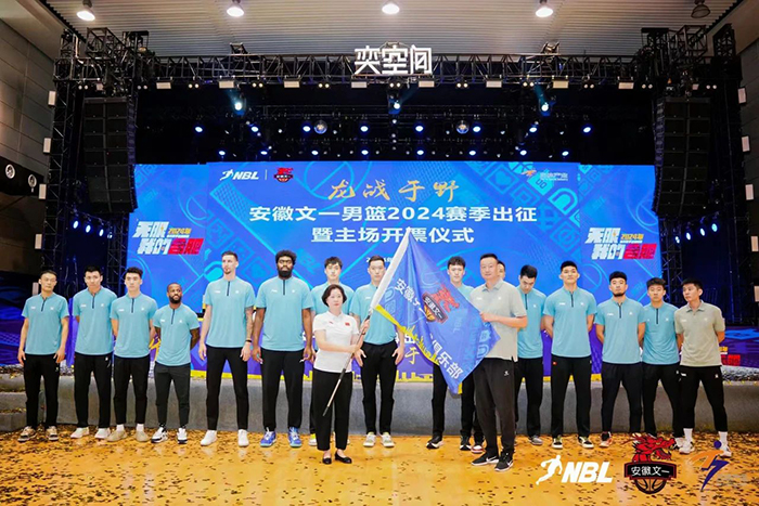 出征儀式現(xiàn)場,安徽省體育局球類運動管理中心黨總支書記李燕代表省體育局向安徽文一授旗,主帥鄭武代表球隊鄭重接旗。隊長楊文博代表球員鄭重宣誓:努力訓練,頑強拼搏,團結協(xié)作,全力衛(wèi)冕。2024賽季,安徽文一的目標依然是奪冠,成為NBL五冠王。