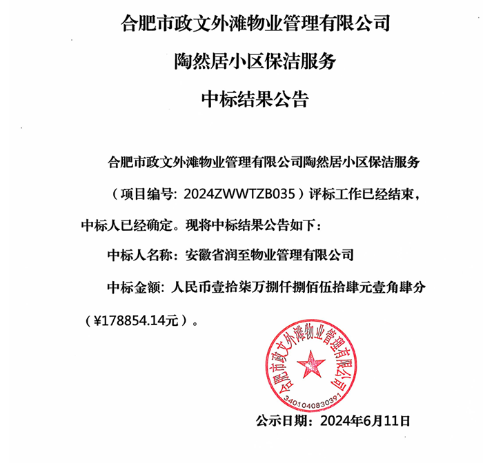 合肥市政文外灘物業(yè)管理有限公司陶然居小區(qū)保潔服務(wù) 中標(biāo)結(jié)果公告