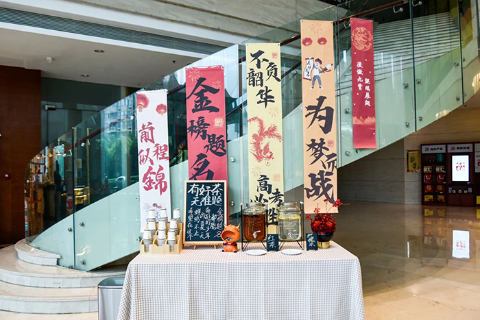 同時為表達對考生的祝福,在各個接待環(huán)節(jié)做了精心的布置。入住禮(高粽)、狀元糖果面點,開放茶水區(qū)、休息區(qū)、考生專屬用餐區(qū)等志愿活動,愛心助考,為夢想護航。