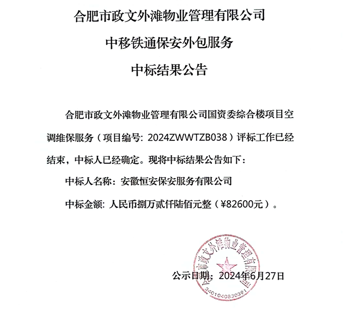 合肥市政文外灘物業(yè)管理有限公司中移鐵通保安外包服務(wù)中標(biāo)結(jié)果公告