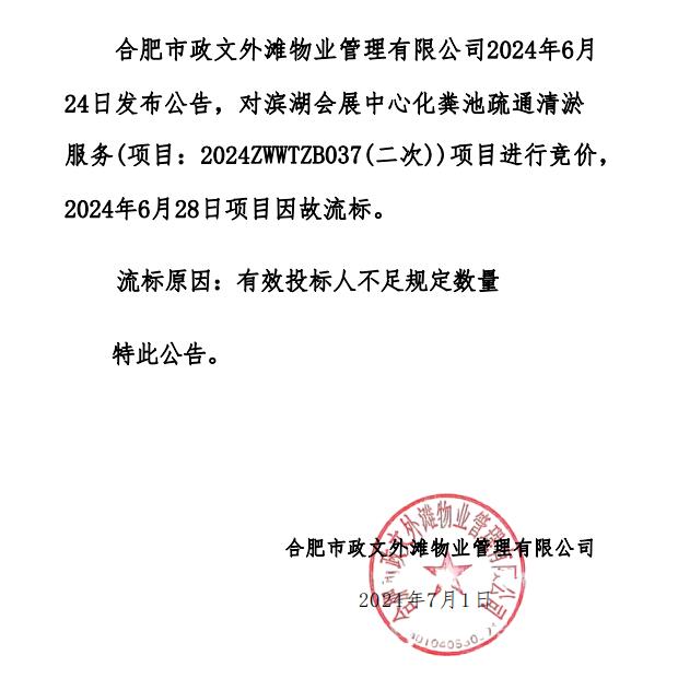 合肥市政文外灘物業(yè)管理有限公司濱湖會展中心化糞池疏通清淤服務(wù)流標公告