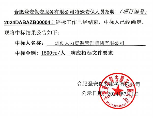 合肥登安保安服務(wù)有限公司特殊安保人員招聘中標(biāo)結(jié)果公告