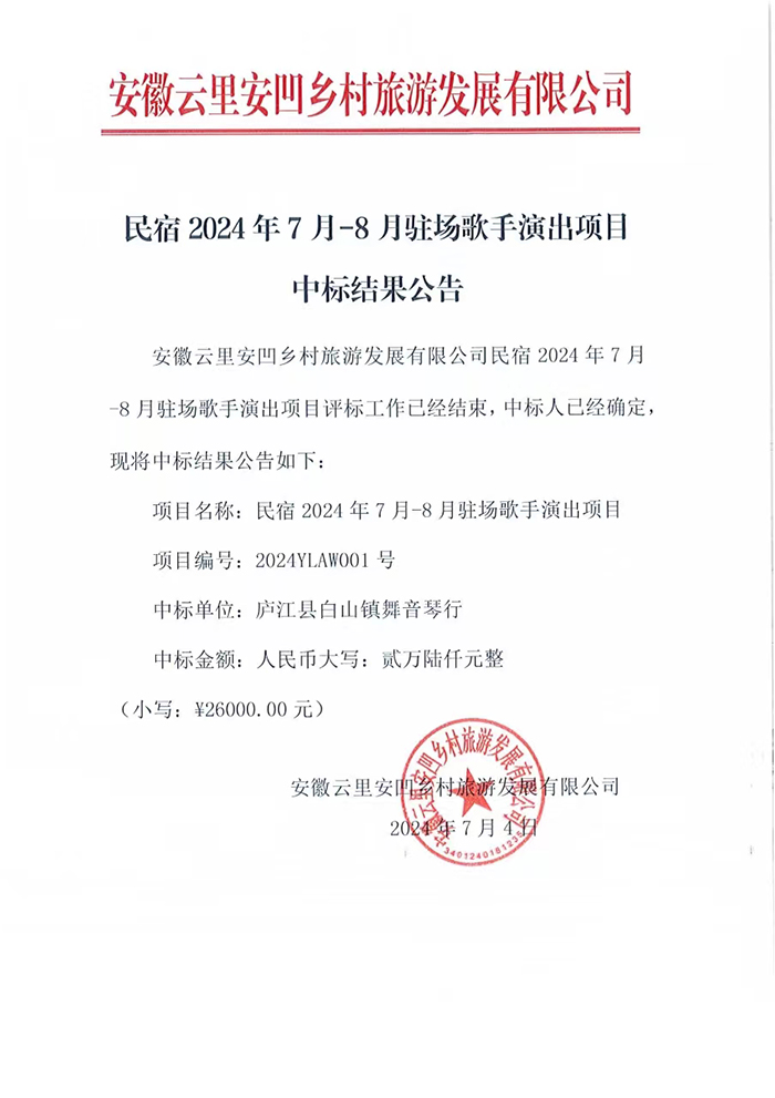 民宿2024年7月-8月駐場歌手演出項目中標結果公告