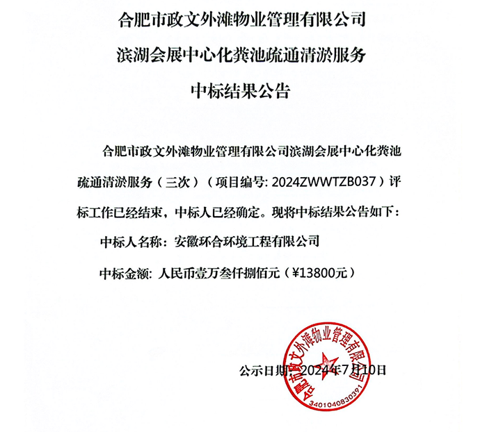 合肥市政文外灘物業(yè)管理有限公司濱湖會展中心化糞池疏通清淤服務(wù)中標(biāo)結(jié)果公告