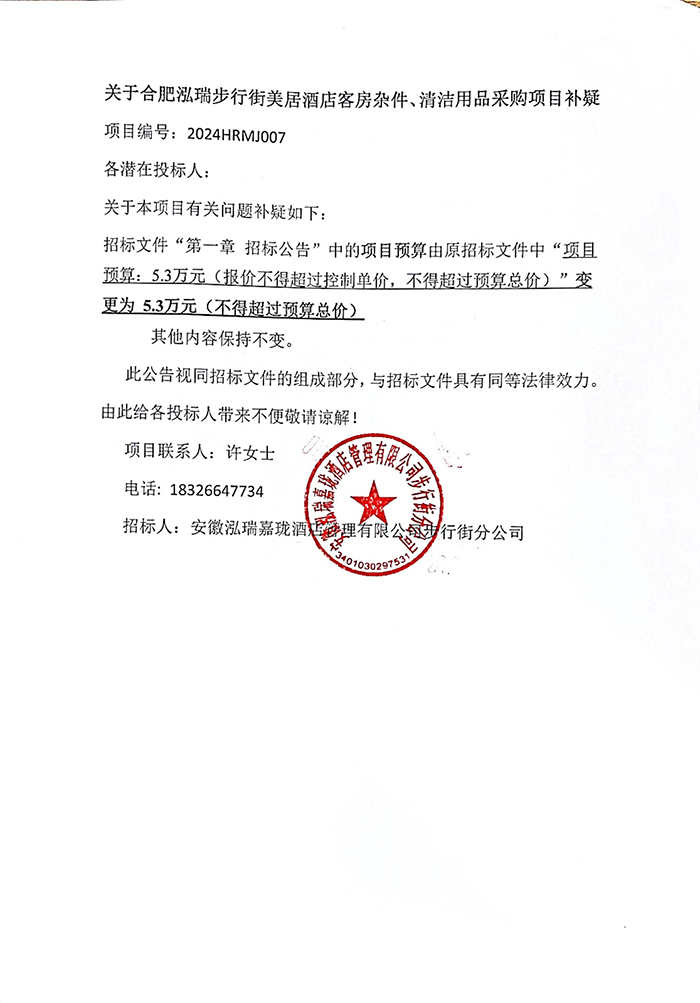 關(guān)于合肥泓瑞步行街美居酒店客房雜件、清潔用品采購項(xiàng)目補(bǔ)疑
