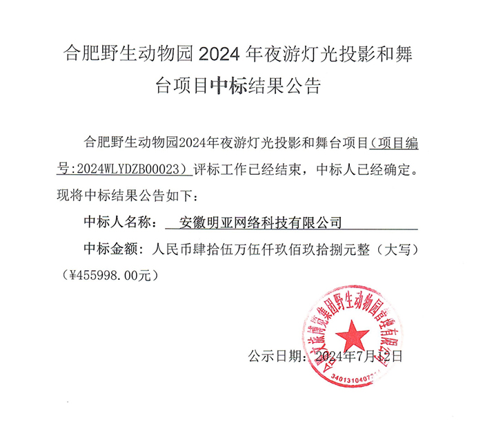 合肥野生動物園 2024年夜游燈光投影和舞臺項目中標結(jié)果公告