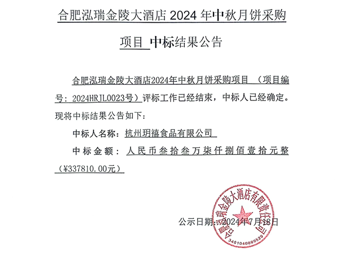 合肥泓瑞金陵大酒店 2024年中秋月餅采購(gòu) 項(xiàng)目中標(biāo)結(jié)果公告