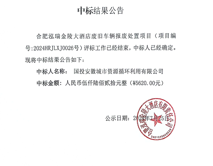 合肥泓瑞金陵大酒店廢舊車輛報廢處置項目
