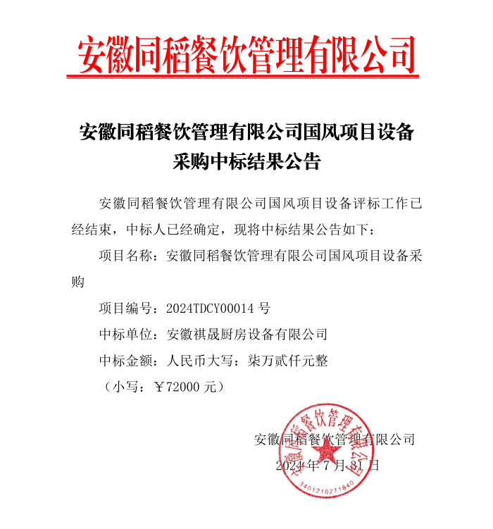 安徽同稻餐飲管理有限公司國(guó)風(fēng)項(xiàng)目設(shè)備采購(gòu)中標(biāo)結(jié)果公告