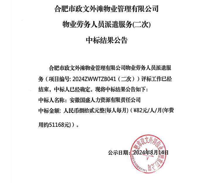 合肥市政文外灘物業(yè)管理有限公司物業(yè)勞務(wù)人員派遣服務(wù)(二次)中標結(jié)果公告