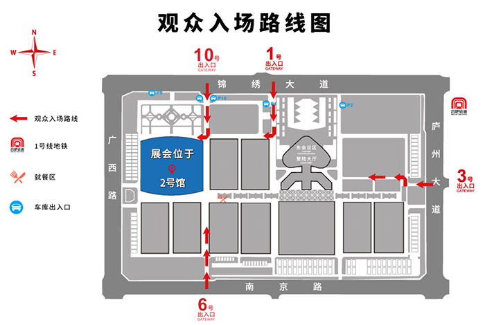 1. 普通觀眾請由上圖所示錦繡大道1號道口及10號道口,廬州大道3號道口,南京路6號道口進(jìn)出參觀。