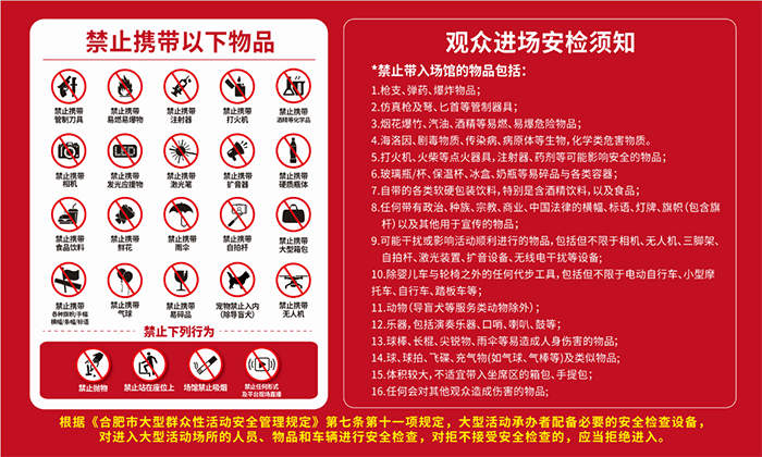 國(guó)家法律法規(guī)明令禁止的其它物品或安檢搜爆警力認(rèn)為與活動(dòng)現(xiàn)場(chǎng)功能不符、明顯影響安全的其它物品;