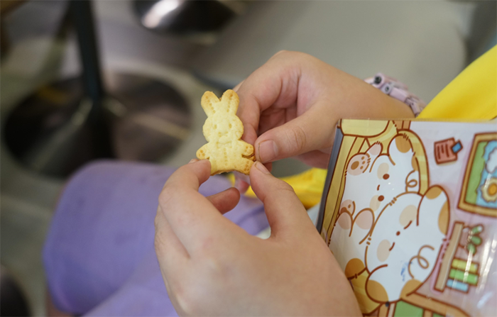 稍作等候,小朋友們自己做的動物餅干烤好出爐了。