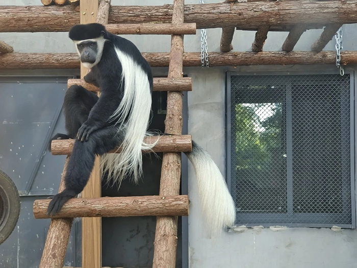 綠樹環(huán)抱中的東非黑白疣猴展館,夏能遮陰,冬能曬太陽