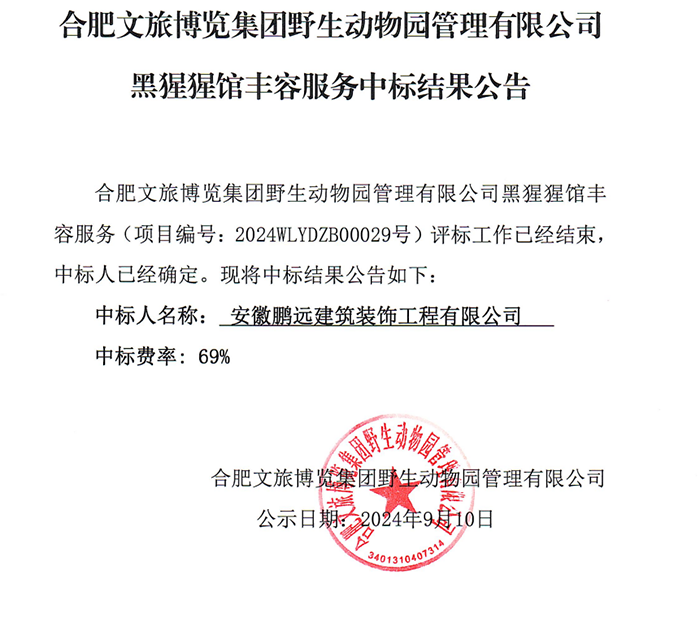 合肥文旅博覽集團(tuán)野生動物園管理有限公司黑猩猩館豐容服務(wù)中標(biāo)結(jié)果公告