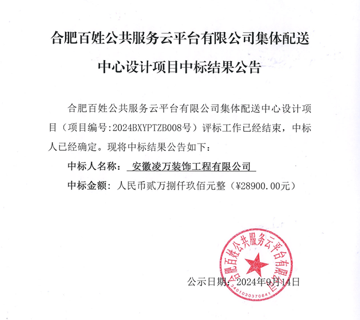 合肥百姓公共服務云平臺有限公司集體配送中心設計項目中標結果公告