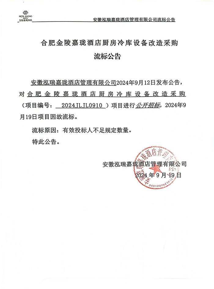 合肥金陵嘉瓏酒店廚房冷庫設(shè)備改造采購流標(biāo)公告